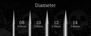את המחטים אפשר להשיג במספר קוטרים בחלק מהחברות הם מיוצגים כ08,10,12,14